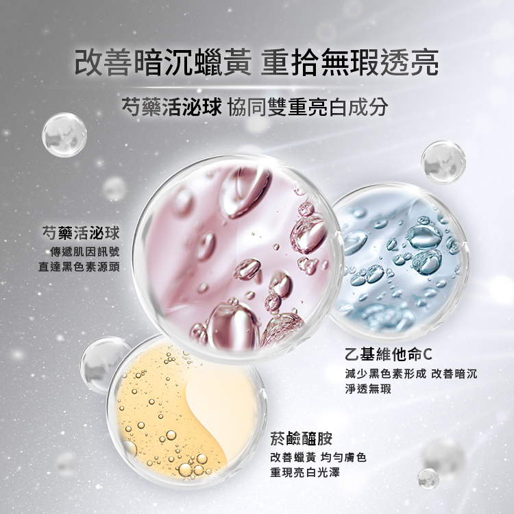 ◎菸鹼醯胺,改善蠟黃,均勻膚色,重現亮白光澤。