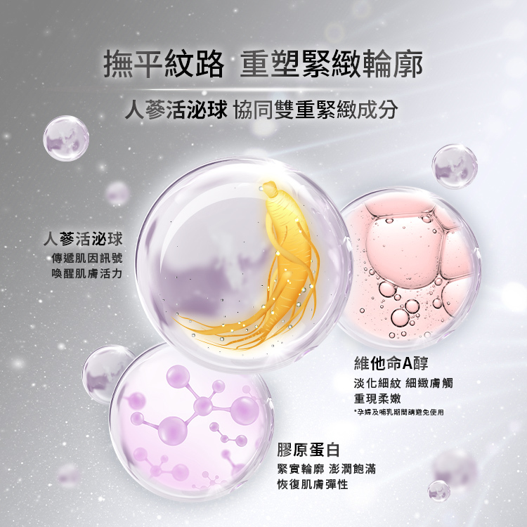 ◎人蔘活泌球,傳遞肌因訊號,喚醒肌膚活力。