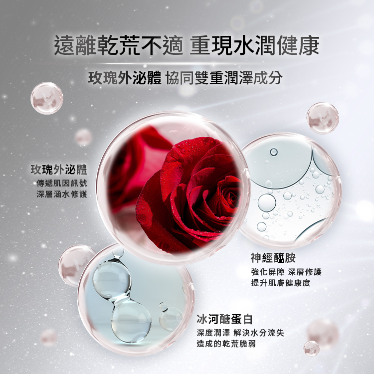 ◎ 玫瑰活泌球,傳遞潤澤訊號,長效極潤涵水。