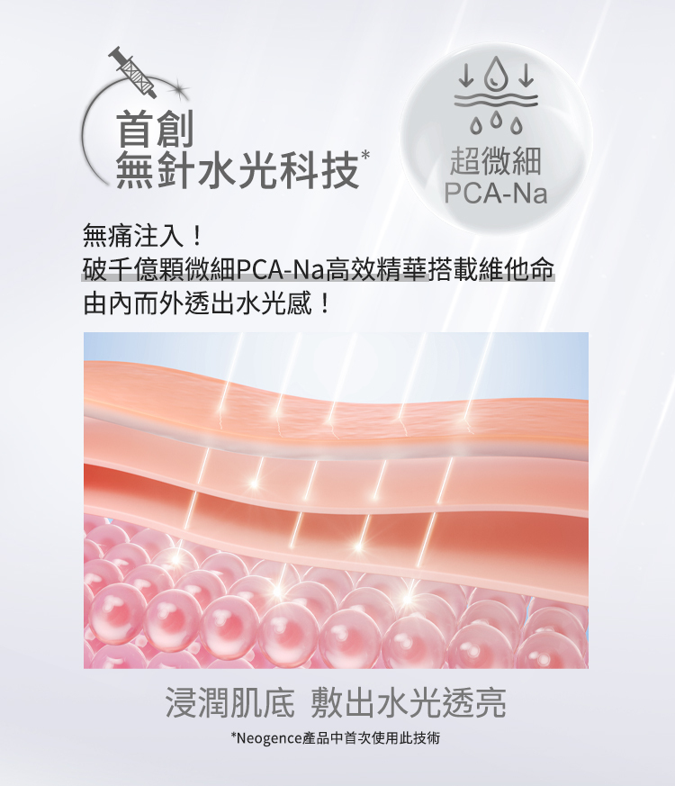 ◎破千億顆超微細PCA-Na浸潤肌底,水光透亮