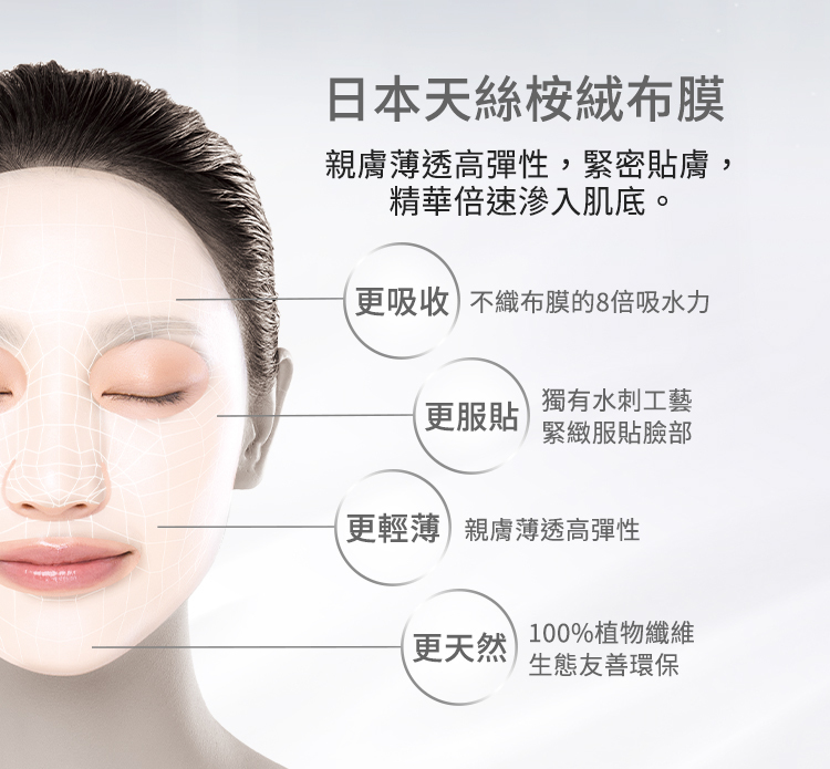 ◎日本天絲桉絨布膜,親膚薄透高彈性,精華倍速滲入肌底