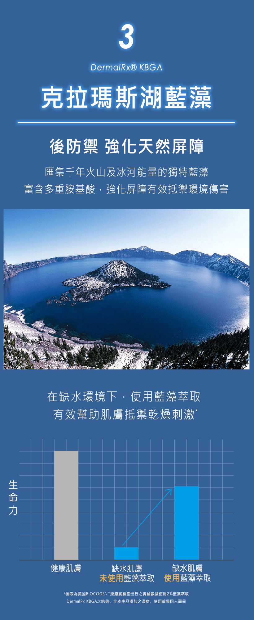 ◎ 克拉瑪斯湖藍藻富含多重胺基酸,強化防護屏障,有效抵禦環境傷害