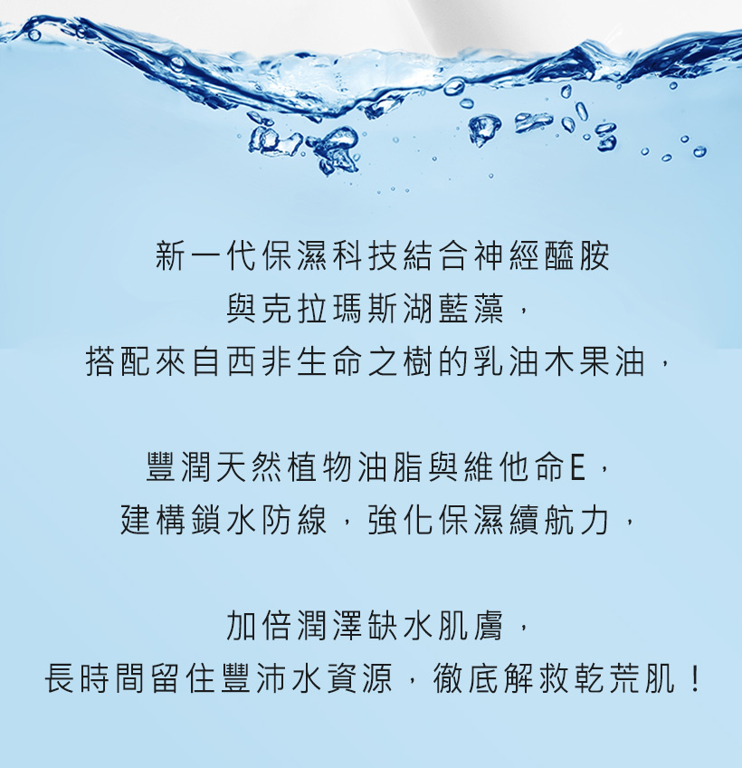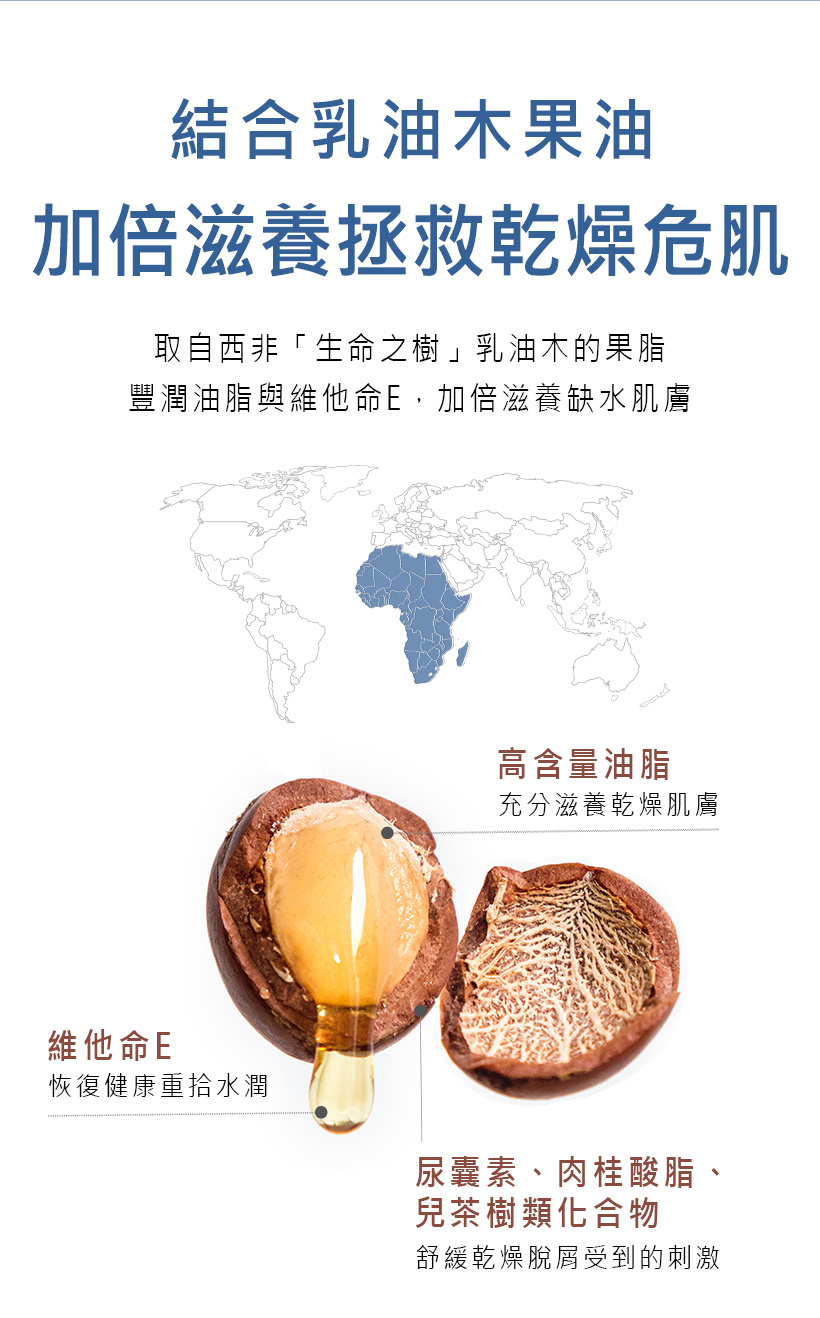 ◎ 乳油木果油豐潤天然植物油脂+維他命E,潤澤鎖水,預防乾燥脫屑