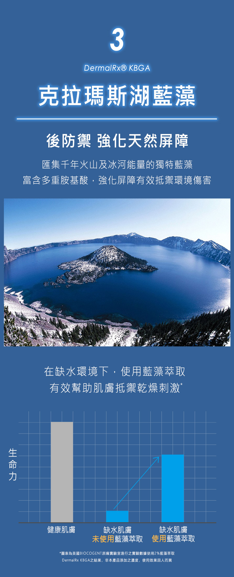 ◎ 克拉瑪斯湖藍藻富含多重胺基酸,強化防護屏障,有效抵禦環境傷害