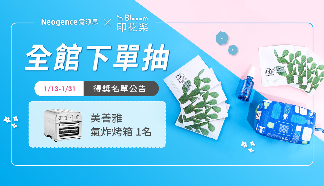 霓淨思官網下單抽『杏仁酸簽名禮盒』『Cuisinart多功能氣炸烤箱』『太魯閣晶英酒店 雙人住宿券』得獎名單,請回覆客服E-mail,提供獎品寄出地址,以利贈品寄出。