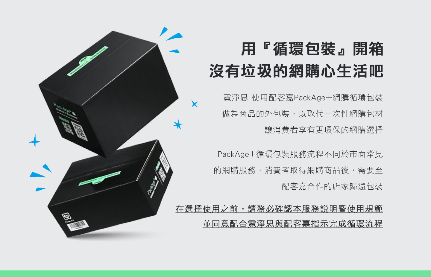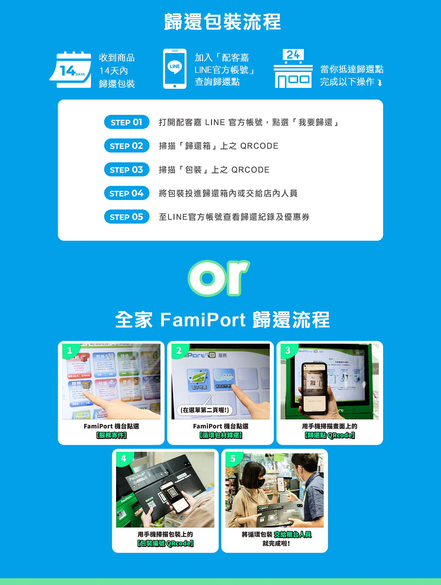 1. 拿到商品後,請在14天內至配客嘉合作歸還點歸還包裝。