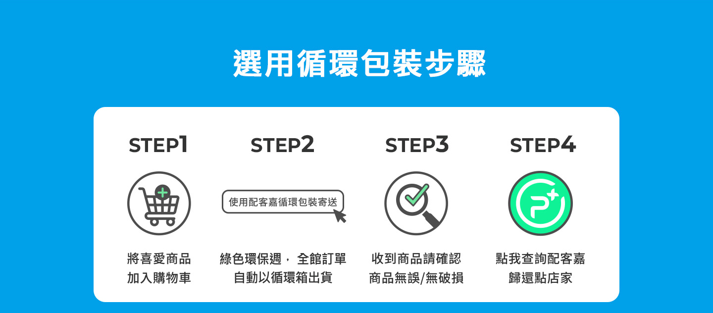 3. 包裝尚未歸還前,請妥善保管並盡快歸還包裝。若在歸還包裝上有困難或遇到任何問題,請聯繫配客嘉客服人員。