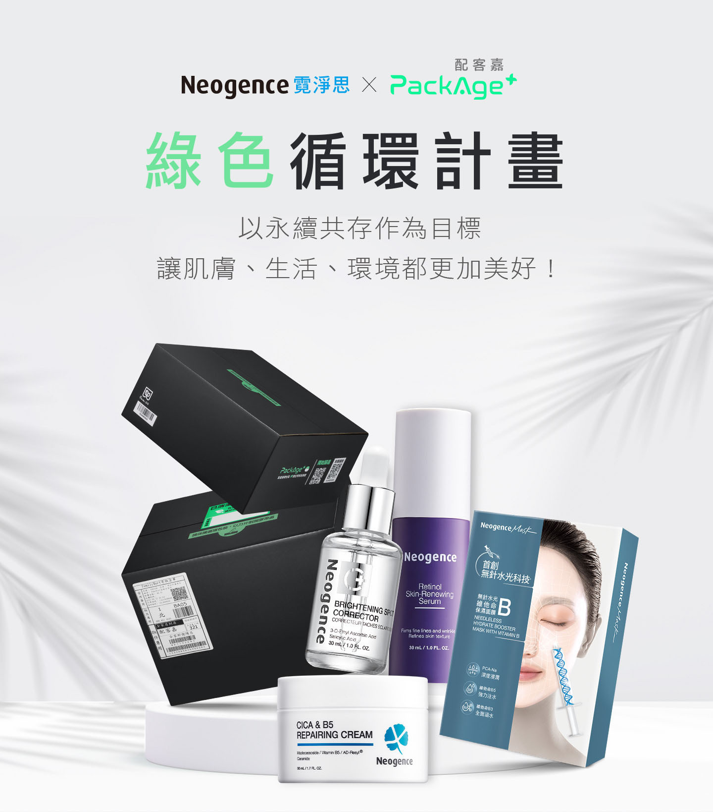 Neogence霓淨思官網 於每月綠色環保日全館使用配客嘉循環箱出貨,於活動期間訂購即可享有會員點數2倍送。(詳情參照活動說明)