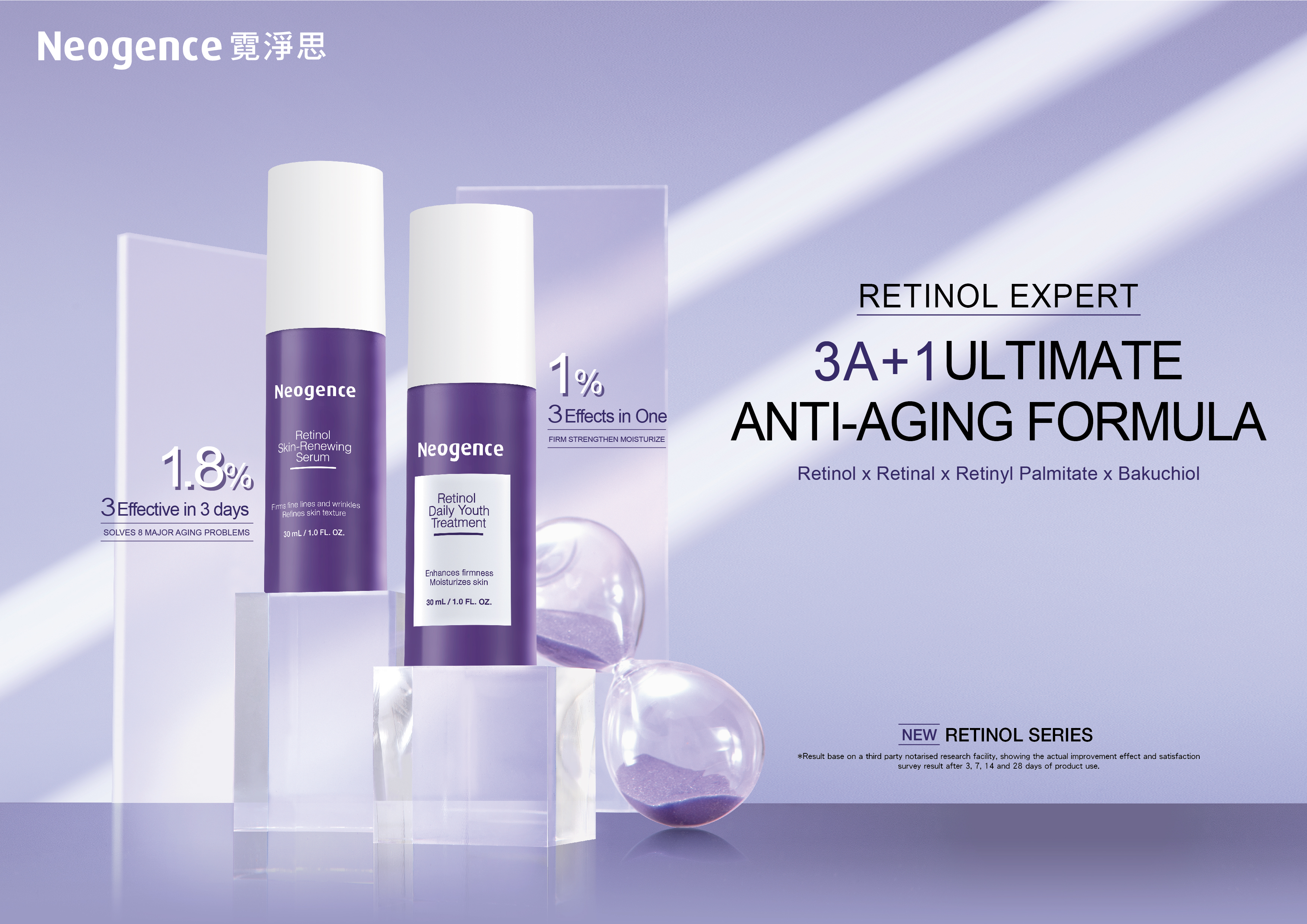 Your retinol expert is here for you to stop the aging. The 3A+1 Ultimate Anti-Aging Formula, Retinol x Retinal x Retinyl Palmitate x Bakuchiol can stabilize and extend the action time of 3A on skin. Two differnt level of concentration to fulfill your anti-agin need.