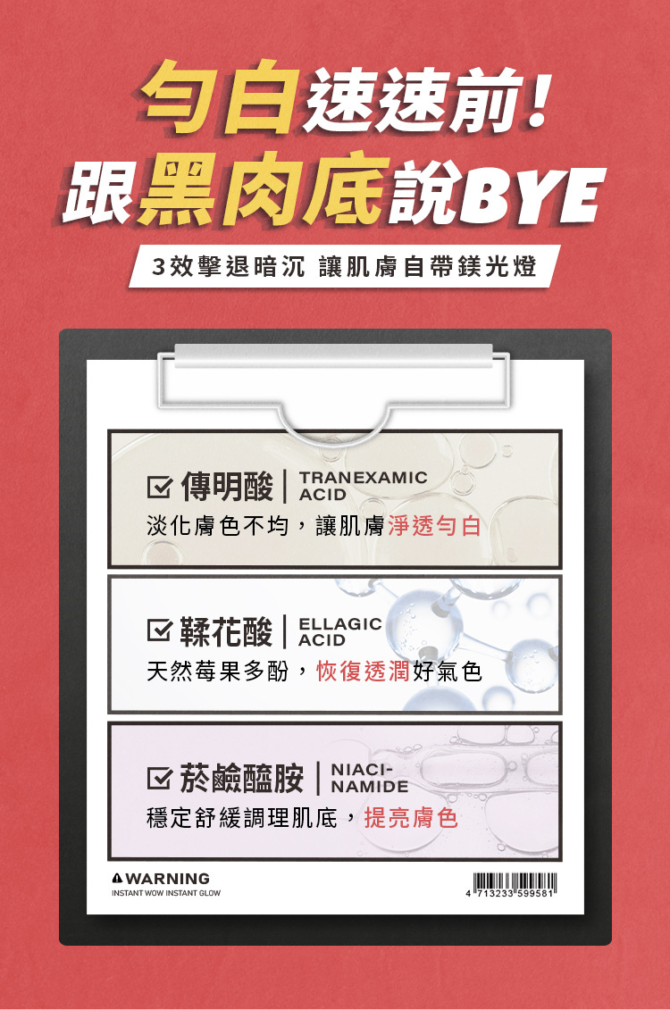 ◎傳明酸+鞣花酸亮白因子,重拾無暇水煮蛋肌